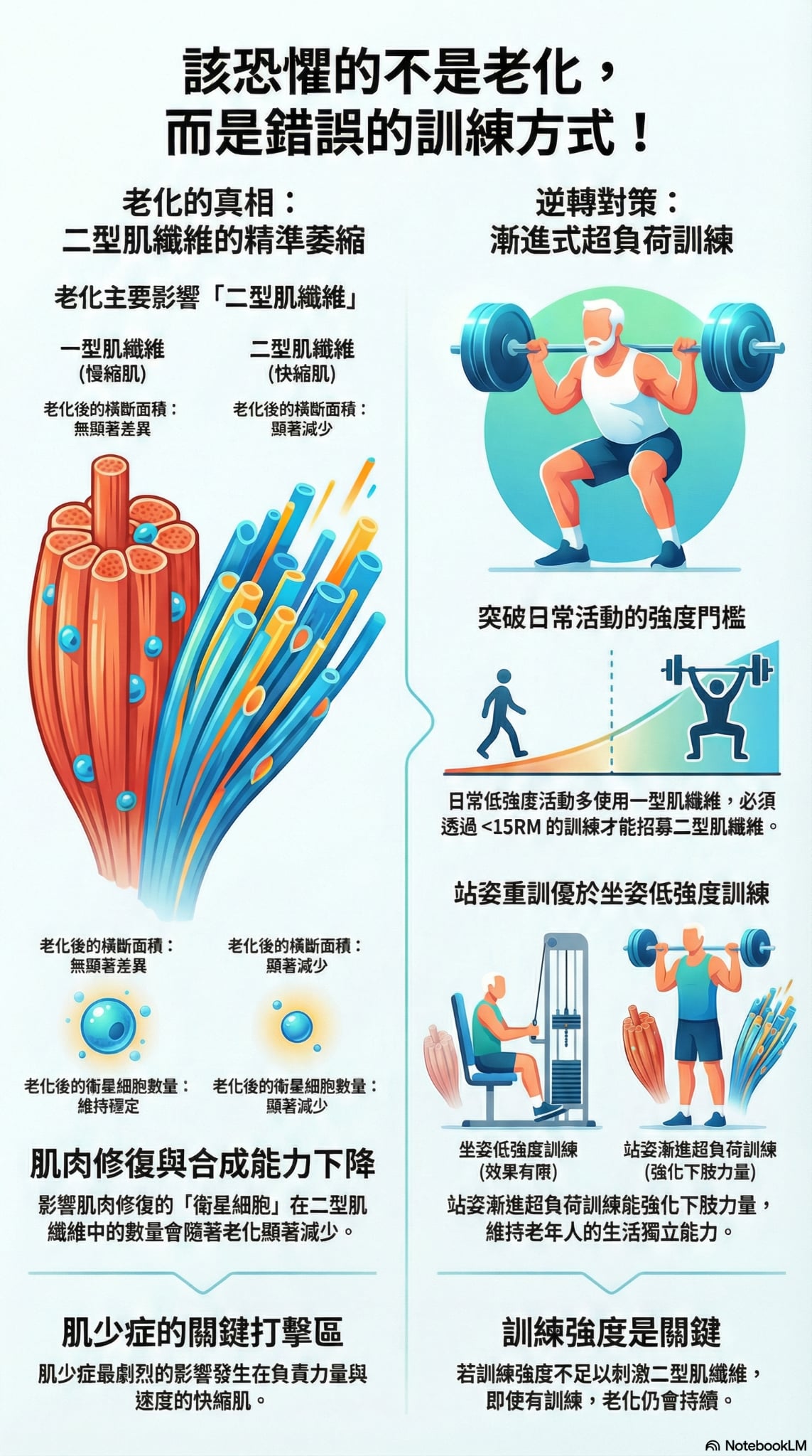 ¡@¡@³Ìªñ¦]¬°¤@¨Ç¾÷½t¥i¥H¸ò«Ü¦h¤H«Å¶Ç°ª±j«×¹B°Ê¸ò«¶q°V½mªº¦n³B¡A¦ý¨Æ¹ê¤W¤]µo²{¤j®a¨ä¹ê¹ï©ó¦Ù¦×ªº¹B°Ê¥Í²z»P¦Ñ¤Æ»{ÃÑ¬Û·í¦³¡A¨Æ¹ê¤W¦Ñ¤Æ¾ÉP¦Ù¦×ÅÖºû¾îÂ_±¿n (cross-sectional area, CSA) ªº´î¤Ö¸ò¦~»´¤H¤ñ°_¨Ó¡A´X¥G¥Dn³£¬Oµo¥Í¦b¤G«¬ (type II) ¦Ù¦×ÅÖºû (§ÖÁY¦Ù) ªº±¿n¡A¦p¤U¹Ï¡A¦U¦ì¥i¥Hµo²{¤@«¬ (type I) ¦Ù¦×ÅÖºû (ºCÁY¦Ù) ªº¾îÂ_±¿n¡A¦b¦~»´¤H¸ò°ªĄ֪̈¤W¨Ã¨S¦³ÅãµÛ®t²§¦s¦b¡C