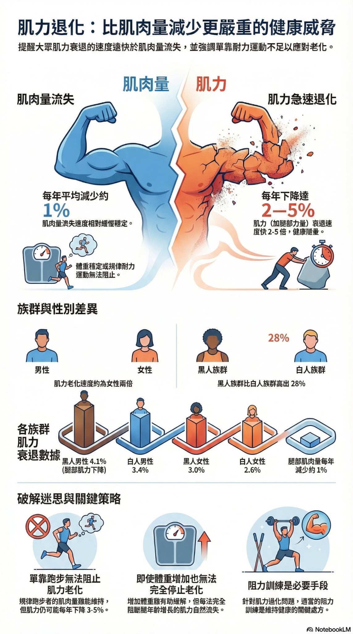 ¡@¡@Goodpasterµ¥ (2006) ¥H1880¦W¦Ñ¦~¤H (73.5¡Ó2.8 ·³) ¬°¹ï¶H¡A¤ÀªR¤T¦~«e«áªº¦Ù¦×½è¶q©M¦Ù¦×¤O¶qªºÅܤơA¥Hµ¥³t¦Ù¤O´ú¶q»ö (KinCom dynamometer) ´ú¶q½¥¦ù¦Ù¤O¶q¡A¥HÂù¯àX®g½u§l¦¬´ú©wªk (dual-energy x-ray absorptiometry, DXA) ©M¹q¸£Â_¼h±½´y (computed tomography, CT) µû¦ô²bÅé«©M¯×ªÕ¶q¡C¬ã¨sµo²{¡A¨k©Ê¦Ù¤O¦Ñ¤Æ´X¥G¬O¤k©Êªº¨â¿¡A¶Â¤H¤ñ¥Õ¤H¦Ù¤O¦Ñ¤Æ¦h28¢H¡A»L³¡¦Ù¤O¨C¦~¤U°²v¥Õ¤H¨k©Ê¬°3.4%¡B¶Â¤H¨k©Ê¬°4.1%¡B¥Õ¤H¤k©Ê¬°2.6%¡B¶Â¤H¤k©Ê¬°3.0%¡A¤j¬ù¬O»L³¡¦Ù¦×¶q´î¤Öªº¤T¿ (»L³¡¦Ù¦×¶q¨C¦~´î¤Ö1%)¡CÁöµM¦Ù¦×¶qªº´î¤Ö»P¦Ñ¦~¤H¦Ù¤Oªº¤U°¦³Ãö¡A¦ý¬O¦Ù¤Oªº¤U°¤ñ¦Ù¦×¶q´î¤Ön§Ö±o¦h¡C