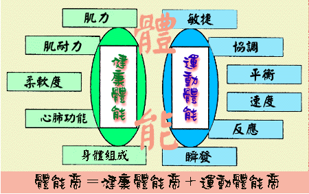 就健康體能來說,主要是指個人能勝任日常工作,有餘力享受休閒娛樂生活,又可應付突發緊急情況的身體能力,其具體要素主要包含肌力、肌耐力、柔軟度、心肺耐力及體脂肪百分比等五項。就運動體能來說,除了包括健康體能的五項要素之外,敏捷、協調、平衡、速度、反應及瞬發等要素,因為與基本運動能力表現的關係較為密切,所以可將之歸類於「運動體能」。