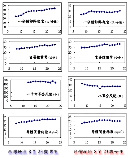 上圖有關各年齡層的健康體能變化資料來看,不管是男生或女生,8至15歲者健康體能會隨著年齡的增加而顯著進步,16至23歲者則比較看不出健康體能進步的趨向,甚至出現退步的情形。這種青春期發育階段顯著進步、青春期以後進步趨於緩和的現象,是因為運動不足的原因,或者是健康體能的特徵,其實需要進一步的瞭解與分析。